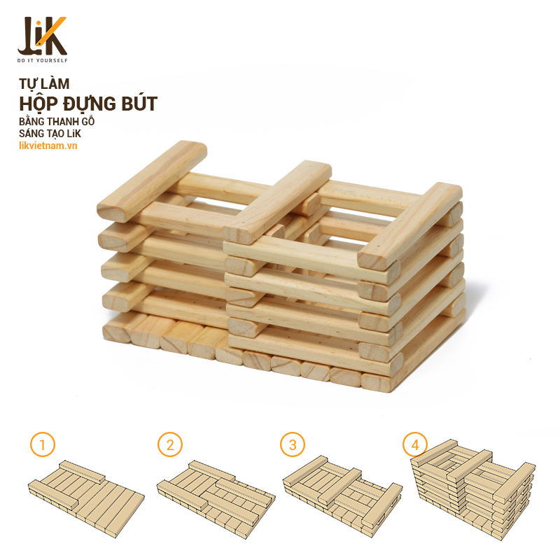 Với các kích thước khác nhau của thanh gỗ sáng tạo, bạn hoàn toàn có thể để tự đóng hộp đựng bút gỗ eco siêu sáng tạo này.
